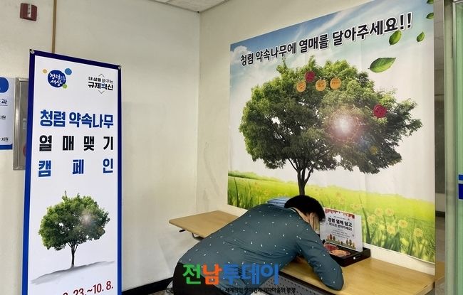 [전남투데이 윤진성 기자]전남동부보훈지청(지청장 김영진)은 9.23(목)부터 10.8(금)까지 청사 1층에서 청렴약속나무 열매맺기 캠페인을 전개한다고 밝혔다.