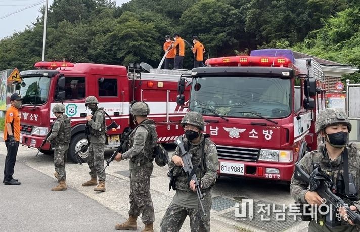 이날 군부대, 경찰, 소방서 등 5개 유관기관단체가 참여한 가운데 소방, 산불진화차량 등 10여 대의 장비가 투입됐다.