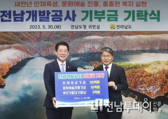 전남투데이 김완규 기자 | 전라남도는 30일 전남개발공사가 인재 육성과 문화예술 및 도민 복지 증진을 위해 수익금 33억 원을 기부하고 지역사회 공헌과 상생나눔 실천에 동참했다고 밝혔다.