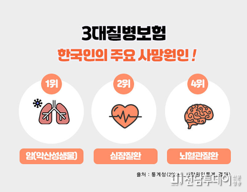 전남투데이 조은별 기자 | 3대질병으로 일컬어지는 암, 뇌혈관질환, 심혈관질환은 한국인의 주요 사망원인에서 상위를 차지하고 있으며, 이에 대한 진단비를 집중적으로 보장해 주는 보험상품을 3대질병진단비 보험이라 할 수 있다.