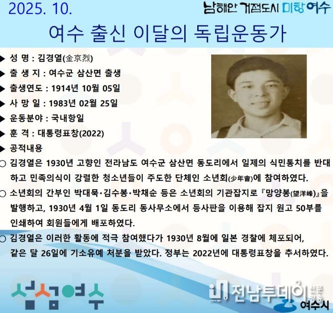 전남투데이 조평훈 기자 | 여수시는 2025년 10월의 독립운동가로 전라남도 여수군 삼산면 출신의 ‘김경열(金京烈)’ 선생을 선정했다.