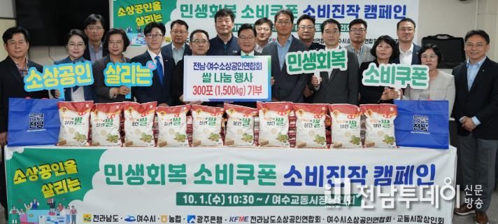 전남투데이 손영욱 기자 | 전라남도와 전남도 소상공인연합회는 1일 여수 교동시장에서 농협과 광주은행으로부터 기부받은 쌀(5kg) 300포를 활용해 지역민과 함께 나누는 ‘민생회복 소비쿠폰 소비 진작 캠페인’을 개최했다고 밝혔다.
