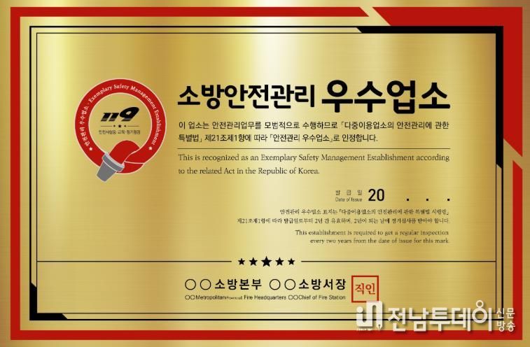 전남투데이 손영욱 기자 | 전남소방본부는 ‘2025년 다중이용업소 안전관리 우수업소’로 인정할 4개 업소에 대해 9월 26일부터 10월 15일까지 20일간 전남도보 및 소방본부 누리집에 공고했다.