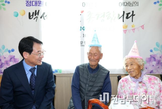 이날 100세 어르신께 드리는 청려장과 함께 과일·참치세트 등 위문품을 전달했으며, 케이크 커팅과 기념촬영을 통해 참석자 모두가 어르신들의 장수를 축하하는 시간을 가졌다.