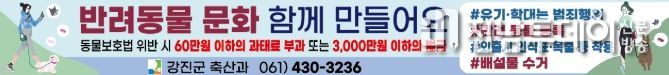 강진군 관계자는 “모든 주민이 함께 안전하고 행복한 생활을 영위할 수 있도록, 성숙한 반려동물 문화조성에 적극 동참하여 주길 바란다”고 당부했다.