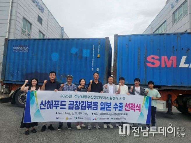 전남투데이 손영욱 기자 | (재)목포수산식품지원센터는 9월 26일, 전남해양수산창업투자지원센터 사업 수혜기업인 산해푸드(대표 오시윤)가 일본 바이어와 체결한 2만3천 달러(한화 약 3천2백만 원) 규모의 곱창김 제품 수출 계약에 따라 센터에서 선적식을 개최했다고 밝혔다.