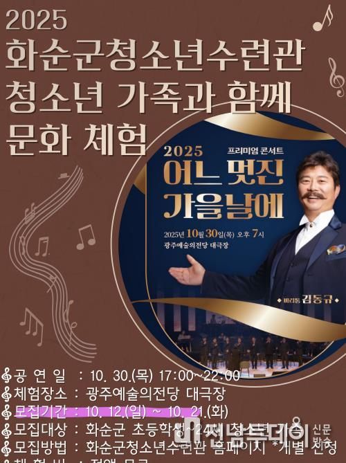 전남투데이 강영선 기자 | 화순군은 2일 청소년수련관에서 짙어가는 가을의 정취 속에 청소년과 가족이 함께하는 특별한 문화체험, 바리톤 김동규의 프리미엄 콘서트'어느 멋진 가을날'을 관람할 청소년 가족 60명을 선착순 모집한다고 밝혔다.