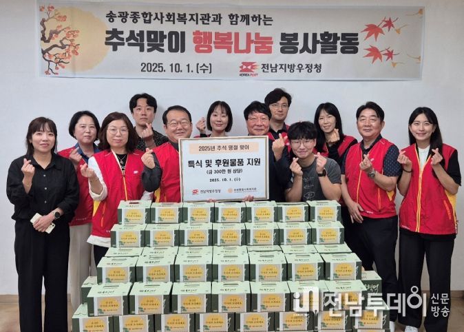 전남투데이 손영욱 기자 | 전남지방우정청은 지난 1일 추석 명절을 맞아 광산구 소재‘송광종합사회복지관’을 방문하여 배식 봉사활동 및 후원물품 전달행사를 진행했다고 밝혔다.
