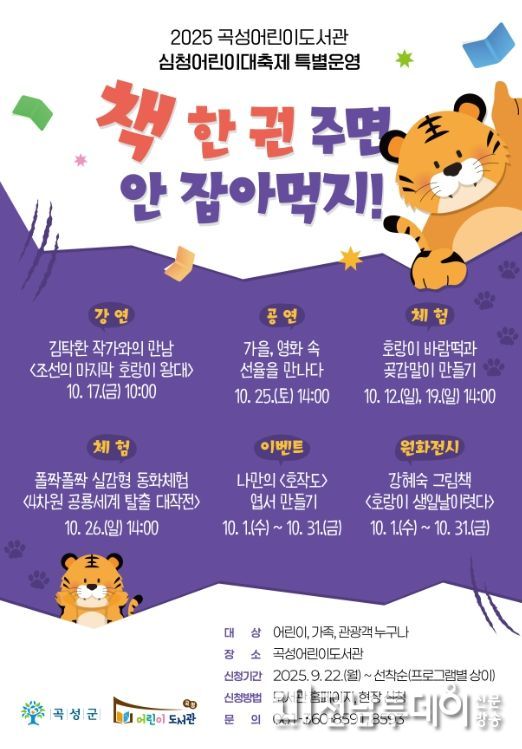 전남투데이 정홍균 기자 | 곡성군은 다가오는 제25회 곡성심청어린이대축제를 기념하여 10월 한 달간 곡성어린이도서관에서 지역민과 방문객을 위한 다양한 볼거리와 독서문화 프로그램을 운영한다고 2일 밝혔다.