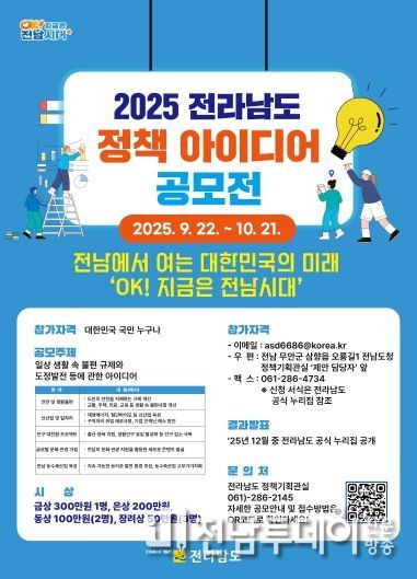전남투데이 손영욱 기자 | 전라남도가 새 정부의 실용주의 기조에 맞춰 ‘생활 속 불편을 찾고 이를 개선할, 지역의 미래를 먹여 살릴 정책’을 주제로 ‘2025년 전라남도 정책 아이디어 공모전’을 개최한다.