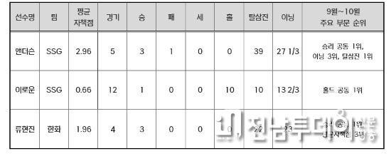 SSG 앤더슨은 9~10월 5경기에 선발 등판해 3승을 거두며 승리 부문 공동 1위에 올랐다. 평균자책점 2.96을 기록했고, 삼진 39개를 잡아내며 탈삼진 부문 월간 1위를 차지했다. 앤더슨은 9~10월 경기 당 평균 8개에 가까운 탈삼진을 잡으며 245탈삼진으로 정규시즌을 마무리했다.