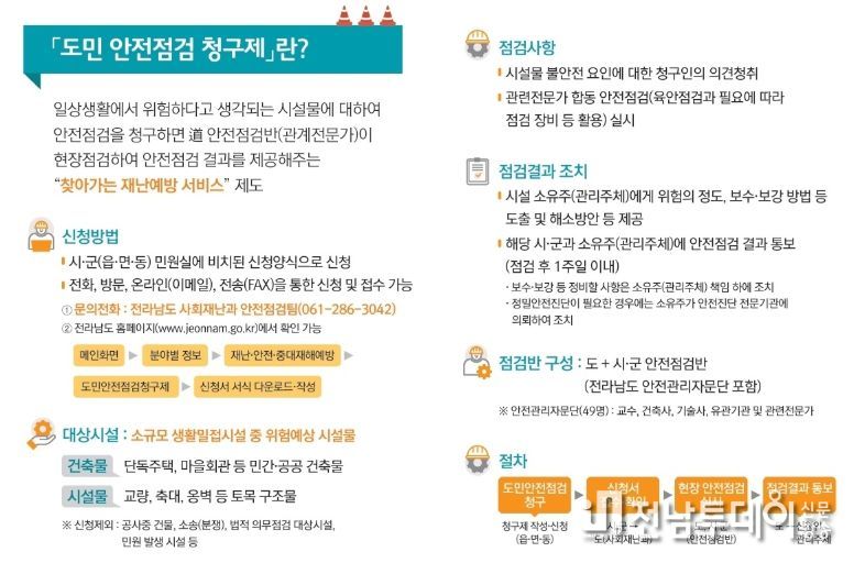 신청은 전남도 사회재난과 안전점검팀으로 전화, 팩스 또는 방문 접수하거나 전남도 누리집을 통해 온라인 접수할 수 있다.