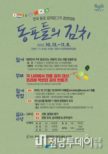 전남투데이 정홍균 기자 | 광주 광산구가 13일부터 11월 18일까지 전국 곳곳에 거주하고 있는 동포들을 대상으로 ‘전국 동포 김치담그기 경연대회_동포들의 김치’를 개최한다.