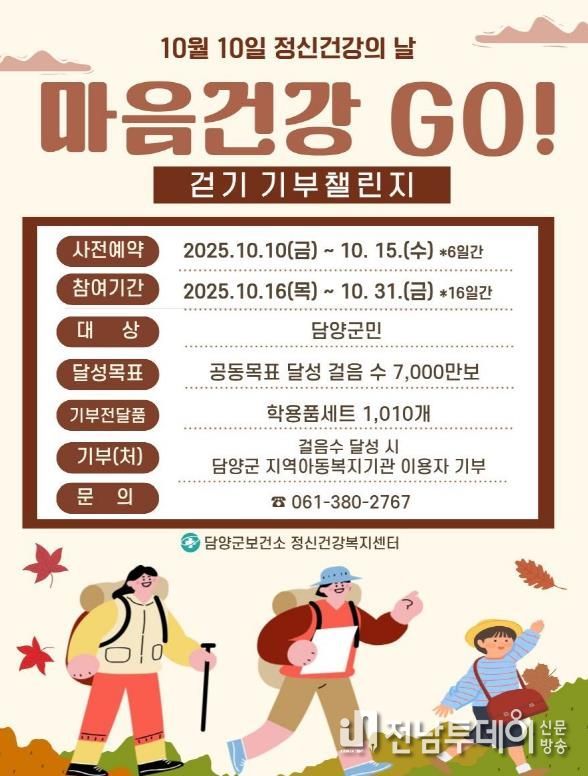 전남투데이 탁상훈 기자 | 담양군은 10월 10일 ‘세계 정신건강의 날’을 맞이하여 전 군민을 대상으로 걷기 기부 챌린지를 운영한다고 밝혔다.
