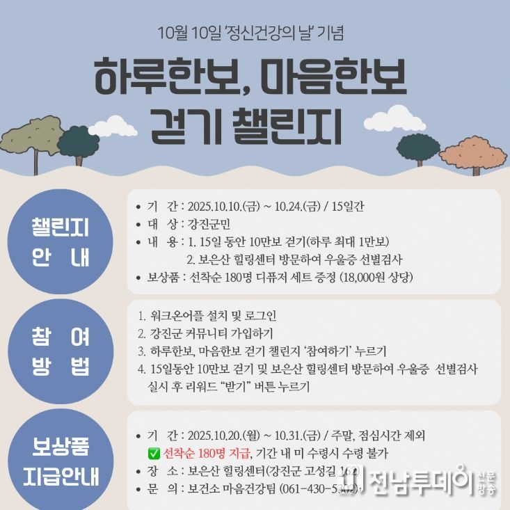 전남투데이 박동운 기자 | 강진군보건소가 지난 10일 정신건강의 날을 기념해 군민 마음 건강을 위한 ‘하루 한보, 마음 한보 걷기 챌린지’를 운영중이다.