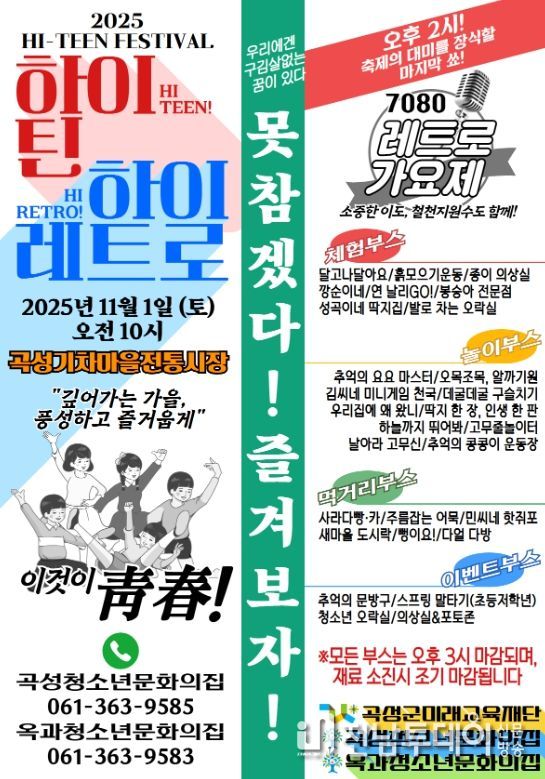 한편, 2025 곡성청소년 하이틴 페스티벌 ‘HI-TEEN, HI-RETRO’는 청소년들의 문화적 감성과 창의성을 표현할 수 있는 장으로, RETRO 가요제, 체험·놀이·먹거리·이벤트 부스 등 총 28개의 부스가 운영될 예정이다. 행사는 오는 11월 1일 곡성기차마을전통시장 일원에서 개최될 예정이다.