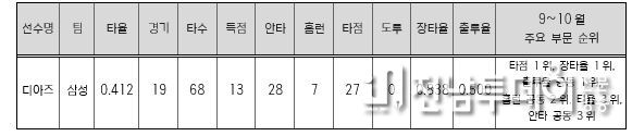 9~10월 MVP로 선정된 디아즈에게는 상금 300만원과 트로피가 전달될 예정이다.