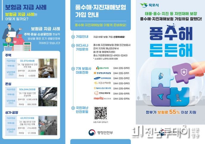 전남투데이 손영욱 기자 | 목포시는 태풍, 홍수, 지진 등 각종 자연재해로 인한 피해에 대비하고, 피해 발생 시 실질적인 보상을 통해 시민의 조기 생활 안정을 돕기 위한 ‘풍수해·지진재해보험’ 사업을 운영하고 있다.
