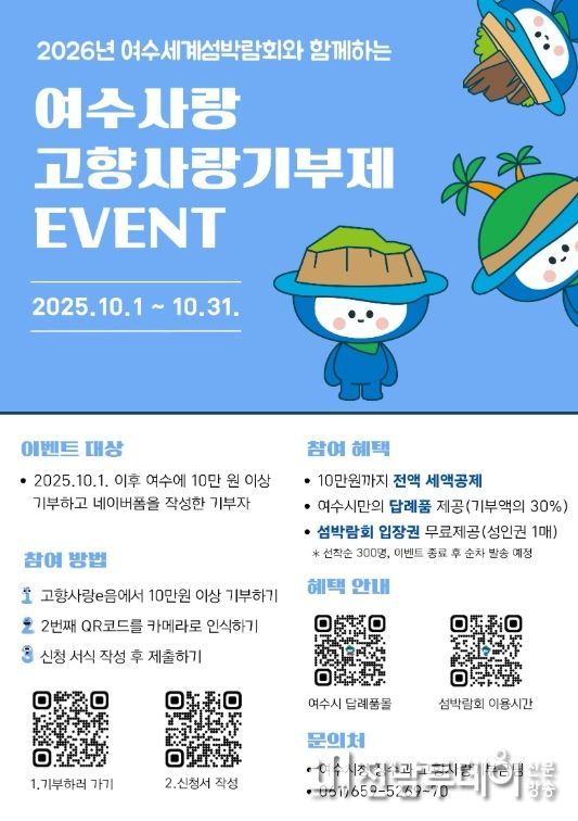 시 관계자는 “고향사랑기부제는 기부금 세액공제와 답례품 제공 등 다양한 혜택을 누릴 수 있는 1석 3조의 제도인데 이번 이벤트로 여수에 기부하면 ‘1석 4조’의 효과를 얻을 수 있다”며 “많은 분들이 고향사랑기부에 함께해주시고 2026여수세계섬박람회에도 큰 관심과 응원을 보내주시길 바란다”고 말했다.