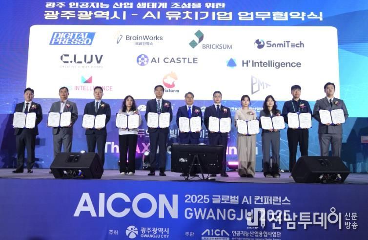 전남투데이 정홍균 기자 | 광주광역시는 15일 김대중컨벤션센터에서 열린 ‘아이콘(AICON) 광주 2025’ 개막식에서 국내 인공지능(AI) 유망기업 10개 사와 ‘광주형 인공지능(AI) 비즈니스 업무협약(MOU)’을 체결했다.