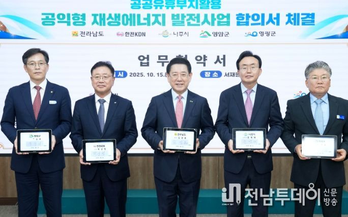 전남투데이 손영욱 기자 | 전라남도는 15일 새정부의 재생에너지 대전환 기조와 재생에너지 보급 확대 정책에 따라 나주시, 영광군, 영암군, 한전KDN과 탄소중립 실현·에너지 기본소득 실현을 위한 ‘공익형 재생에너지 발전사업’ 업무협약을 했다고 밝혔다.