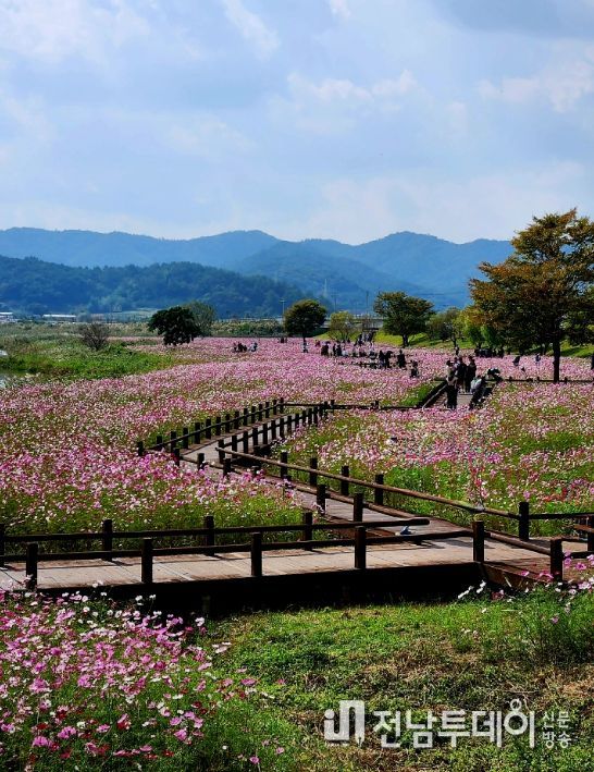 나주 영산강정원은 분홍, 노랑 등 형형색색의 대규모 코스모스 꽃길이 조성됐다.