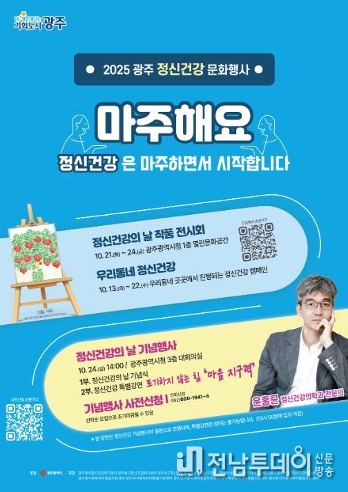 전남투데이 정홍균 기자 | 광주광역시는 ‘정신건강 홍보주간’(10월 10~24일)을 맞아 시민의 마음 건강 증진을 위한 다양한 문화행사를 연다.