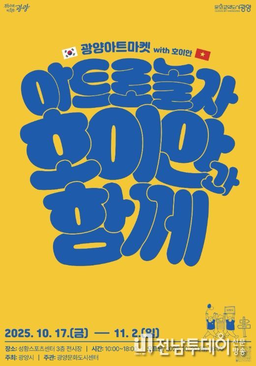 전남투데이 조평훈 기자 | 광양문화도시센터는 오는 10월 17일부터 11월 2일까지 성황스포츠센터 다목적체육관 3층 대회운영본부와 로비에서 ‘광양아트마켓 위드 호이안(with Hoi An) 아트로 놀자! 호이안과 함께!’ 행사를 개최한다고 밝혔다.