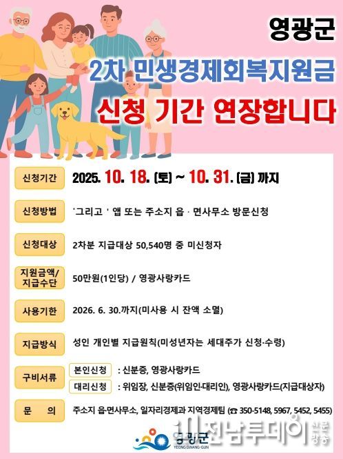 전남투데이 박세훈 기자 | 영광군은 전 군민에게 50만 원(2차분)을 지급하는 민생경제회복지원금 신청 기간을 10월 31일까지 2주 더 연장한다.