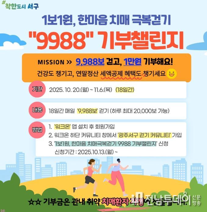 전남투데이 정홍균 기자 | 광주광역시 서구가 오는 20일부터 11월 6일까지 18일간, 치매 인식 개선과 기부문화 확산을 위한 ‘1보1원, 한마음 치매극복걷기 9988 기부챌린지’를 진행한다.