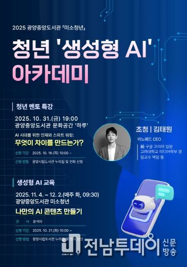 ‘청년 멘토 특강’은 10월 16일 오전 10시부터, ‘생성형 AI 교육’은 10월 21일 오전 10시부터 각각 선착순으로 접수하며, 광양시립도서관 누리집과 전화로 신청할 수 있다. 자세한 사항은 광양중앙도서관으로 문의하면 된다