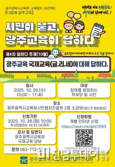 한편 시민협치진흥원은 오는 12월 16일에는 올해 운영된 ‘시민이 묻고, 광주교육이 답하다’ 행사 내용을 종합해 이정선 교육감과 함께 하는 타운홀 미팅 ‘2025 광주교육 100인 100분 토론회’ 행사를 운영한다.