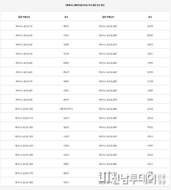 제네시스 포인트 1위 옥태훈(27.금강주택)을 비롯해 2위 이태훈(35.캐나다), 3위 김백준(24.속초아이), 4위 최진호(41.COWELL), 5위 배용준(25.CJ), 6위 문도엽(34.DB손해보험), 7위 최승빈(24.CJ), 8위 신용구(34.금강주택), 9위 송민혁(21.CJ), 10위 사돔 깨우깐자나(27.태국)까지 제네시스 포인트 TOP10 선수들과 36위 정한밀(34.경희), 37위 김동민(27.NH농협은행)까지 제네시스 포인트 상위 36명이 참가자 명단에 이름을 올렸다.
