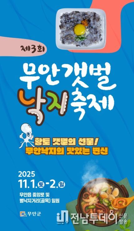 전남투데이 김길룡 기자 | 전남 무안군은 11월 1, 2일 이틀간 '황토갯벌의 선물! 무안낙지의 맛있는 변신' 이라는 주제로 무안읍 뻘낙지 거리 및 중앙로 일원에서 제3회 무안갯벌낙지축제를 개최한다.