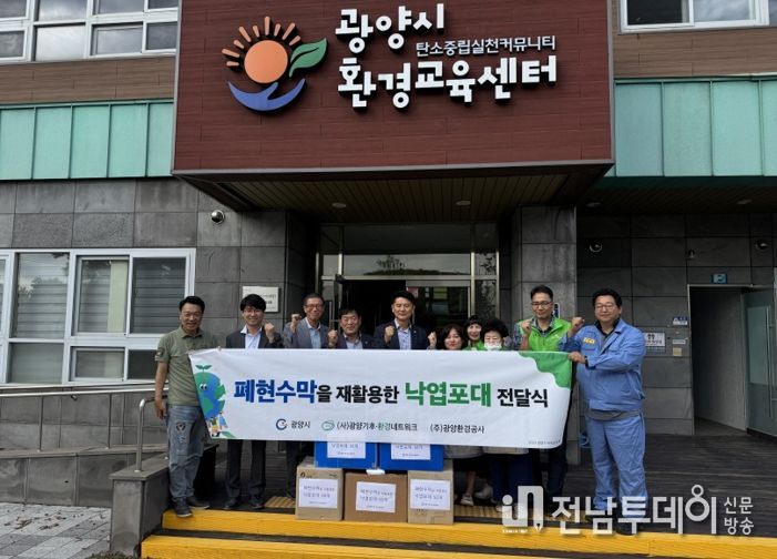 지난 10월 16일, (사)광양기후·환경네트워크는 깨끗한 거리 조성과 폐현수막 재활용 촉진을 위해 낙엽 수거용 마대 250개를 ㈜광양환경공사에 전달했다.