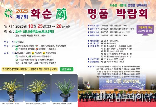 전남투데이 강영선 기자 | 대한민국 난(蘭) 산업의 중심지로 자리매김하고 있는 전남 화순군이 ‘제7회 2025 화순 난 명품 박람회’를 오는 10월 25일부터 26일까지 이틀간 화순 하니움문화스포츠센터 실내체육관에서 개최한다.