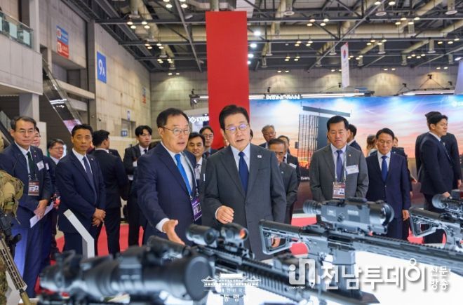 전남투데이 정홍균 기자 | 이재명 대통령은 오늘 오전 킨텍스에서 개최된 ‘2025 서울 국제 항공우주 및 방위산업 전시회’ 개막식과 ‘방위산업 발전 토론회’에 참석했다.