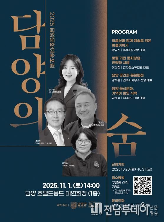 전남투데이 김길룡 기자 | 담양군문화재단은 11월 1일 토요일 오후 2시, 담양 호텔드몽드 대연회장에서 2025 담양 문화예술포럼 '담양의 숨'을 개최한다고 밝혔다.