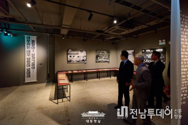 이 대통령은 故 박종철 열사가 고문을 받다 숨진 509호와 민주화운동청년연합 의장으로 활동하다 붙잡혀 고초를 겪었던 故 김근태 전 의원 조사실인 515호 등 전시관을 모두 살펴봤다.