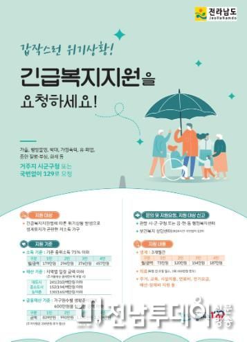 정광선 전남도 보건복지국장은 “갑작스러운 위기상황에 놓이면 주저하지 말고 가까운 읍면동 주민센터나 129 또는 120, 복지위기알림앱 등으로 도움을 요청하길 바란다”며 “전남도와 민관이 함께 위기가정을 조기에 발굴하고 필요한 지원이 누락되지 않도록 사회복지 행정을 펼치겠다”고 말했다.