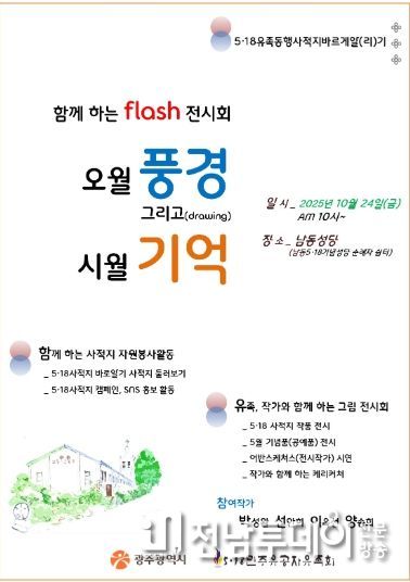 전남투데이 정홍균 기자 | 광주광역시는 5·18민주유공자유족회와 함께 24일 동구 남동5·18기념성당에서 시민과 함께하는 ‘오월 풍경 그리고(drawing) 시월 기억’ 전시회를 개최한다.
