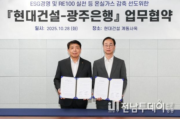광주은행은 현대건설과 ‘ESG경영 및 RE100 실천 등 온실가스 감축 선도 위한 업무협약’을 체결했다고 29일 밝혔다. 협약식은 현대건설 본사에서 정일선 광주은행 부행장과 이동훈 현대건설 상무 및 관계자들이 참석한 가운데 진행됐다.