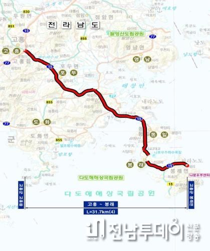 전남투데이 조평훈 기자 | 고흥군은 30일 국토교통부가 '제5차 국도・국지도 건설계획 (2021~2025)'을 변경·고시함에 따라 ‘국도 15호선 고흥~봉래 확장사업’의 신속한 추진이 탄력을 받게 됐다고 밝혔다.