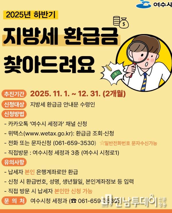 전남투데이 조평훈 기자 | 여수시는 시민의 권익 보호와 세정 신뢰도 제고를 위해 11월부터 12월까지 두 달간 ‘하반기 지방세 환급금 찾아주기 추진기간’을 운영한다.