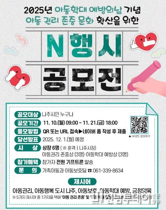 나주시 관계자는 “시민이 직접 참여해 아동의 권리와 학대 예방의 중요성을 함께 생각하는 의미 있는 공모전이 될 것으로 기대한다”고 밝혔다.