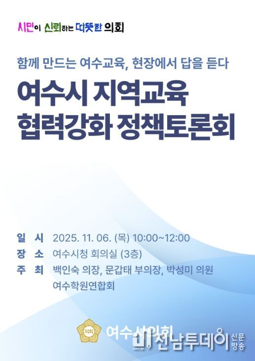 전남투데이 조평훈 기자 | 여수시의회는 오는 11월 6일 오전 10시, 여수시청 3층 회의실에서 “함께 만드는 여수교육, 현장에서 답을 듣다”를 주제로 ‘여수시 지역교육 협력강화 정책토론회’를 개최한다.