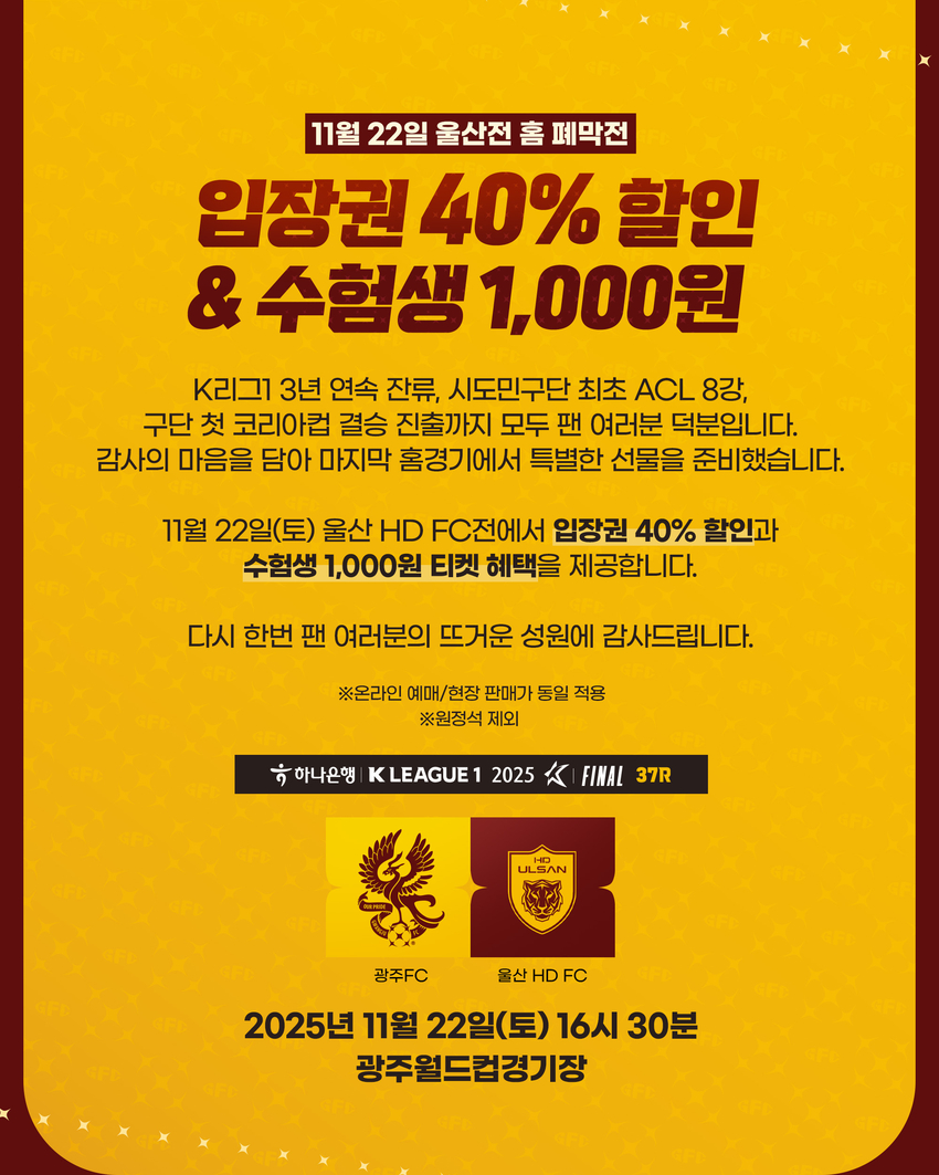 광주는 오는 22일(토) 16시 30분, 광주월드컵경기장에서 열리는 하나은행 K리그1 2025 37라운드 울산HD FC전을 홈 폐막전으로 치르며, 팬들의 뜨거운 성원에 보답하고자 입장권 40% 할인 이벤트를 실시한다고 밝혔다.