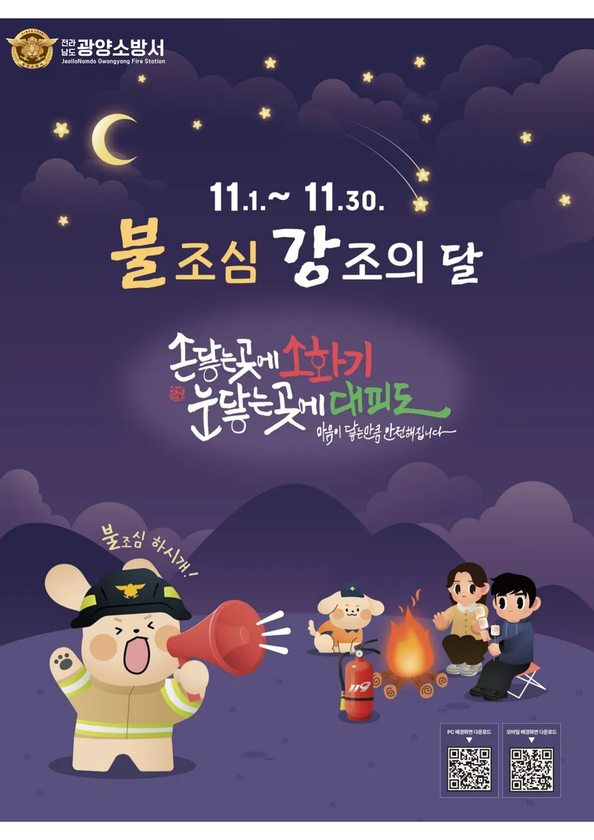 김옥연 광양소방서장은 “겨울철을 앞두고 운영되는 ‘불조심 강조의 달’을 통해 시민의 화재예방 분위기를 조성하고 안전문화 환경조성에 적극 노력하겠다” 고 전했다.