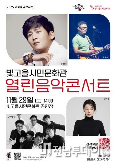 전남투데이 정홍균 기자 | 광주문화재단은 오는 11월 29일 빛고을시민문화관 공연장에서 ‘2025 대중음악콘서트(2회차)’를 전석 무료로 개최한다고 밝혔다. 이번 공연은 시민 문화복지 실현과 문화 접근성 확대를 위한 열린 음악회로, 지역민 누구나 부담 없이 참여할 수 있는 공공기획 공연이다.