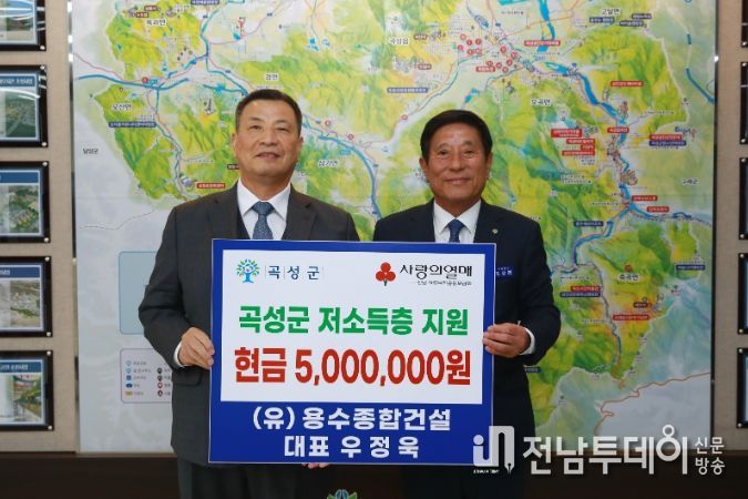 전남투데이 정홍균 기자 | 전남 곡성군은 지난 17일 여수시 화장동에 소재한 (유)용수종합건설(대표 우정욱)에서 곡성군 노인맞춤돌봄서비스 이용 어르신을 지원하기 위해 현금 500만 원을 기탁했다고 18일 밝혔다.